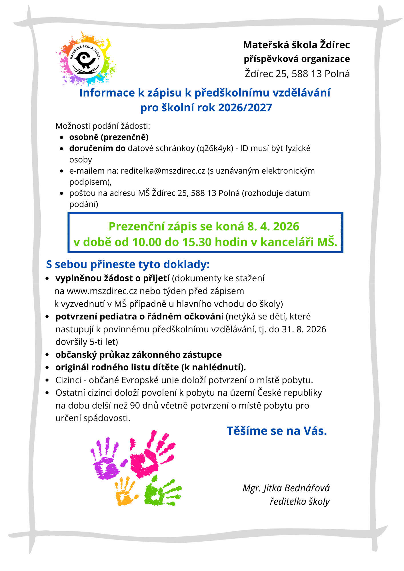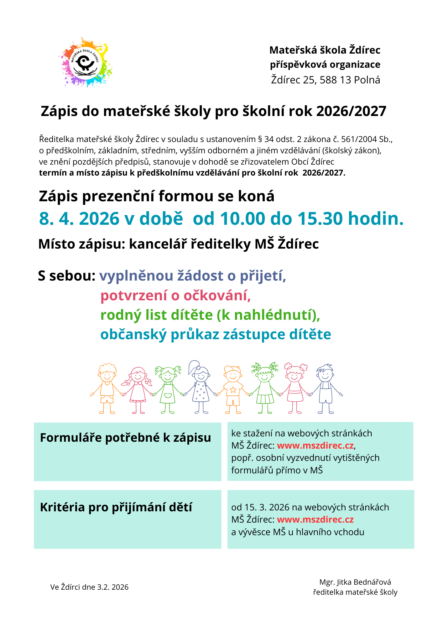 | 12.02.2026 | Zápis do MŠ 2026/27 | Dokumenty pro rodiče | Stáhnout soubor |