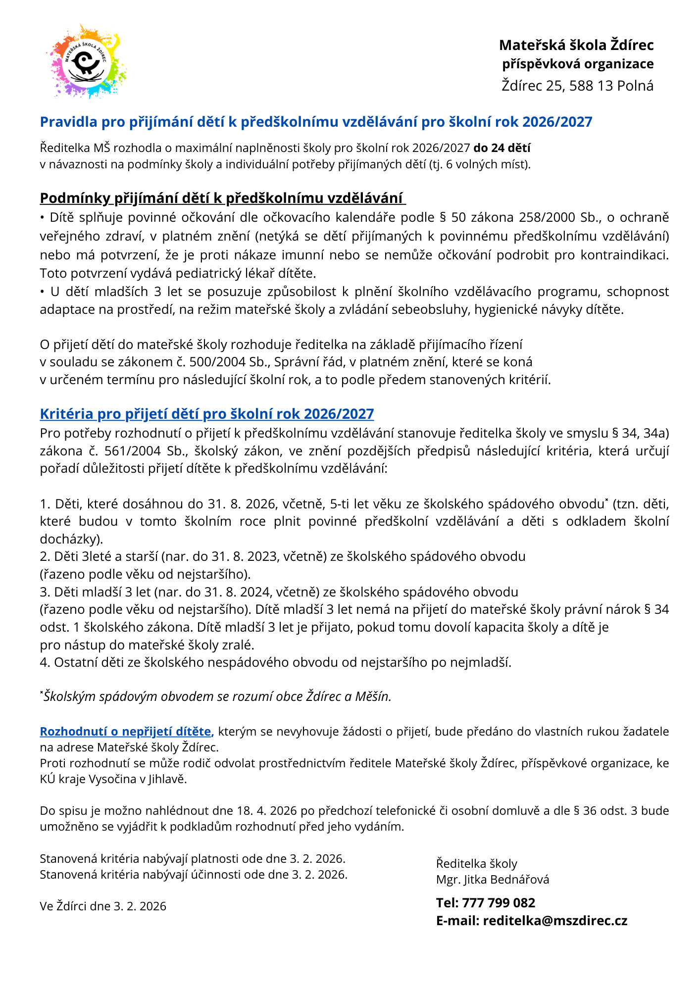 | 15.03.2026 | Pravidla a kritéria pro zápis 2026 | Dokumenty pro rodiče | Stáhnout soubor |